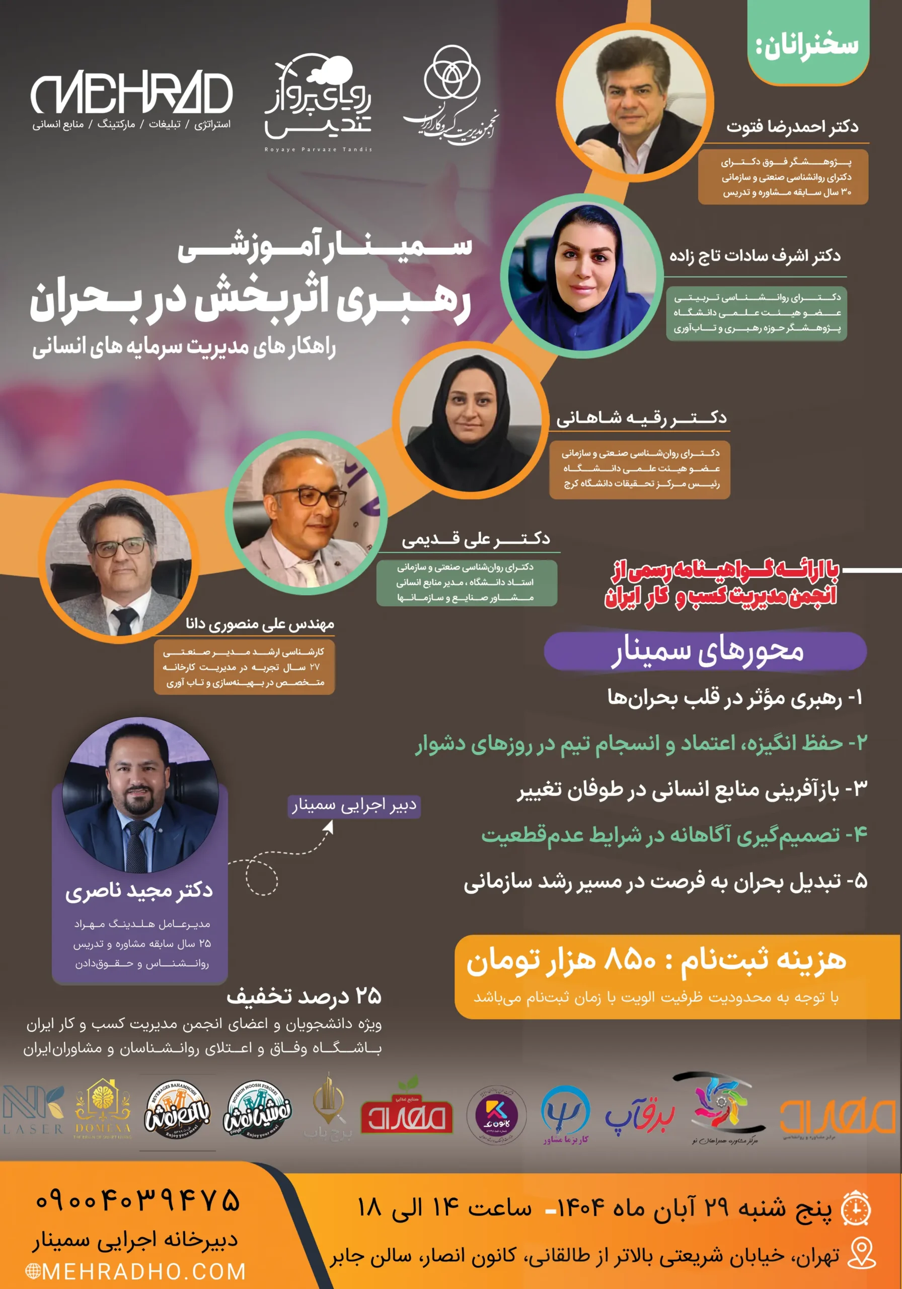 این همایش به میزبانی دکتر مجید ناصری ( مدیرعامل هلدینگ بین المللی مهراد ) با حضور و سخنرانی اساتید دانشگاهی و سازمانی، دکتر احمدرضا فتوت (پـــژوهــــشـگر حوزه صنایع و سازمان)، دکتر اشرف سادات تاج زاده ( روانشناس و عضو هیئت علمی دانشگاه) دکتر رقیه شاهانی(روانشناس و عضو هیئت علمی دانشگاه) دکتر علی قدیمی ( روانشناس و مشاور صنایع و سازمانها) مهندس علی منصوری دانا ( متخصص در بهینه سازی و تاب آوری) در شهر تهران، خیابان شریعتی بالاتر از طالقانی، کانون انصار، سالن جابر مورخه پنج شنبه ۲۹ آبان ماه ۱۴۰۴ ساعت ۱۴ الی ۱۸ برگزار خواهد شد.